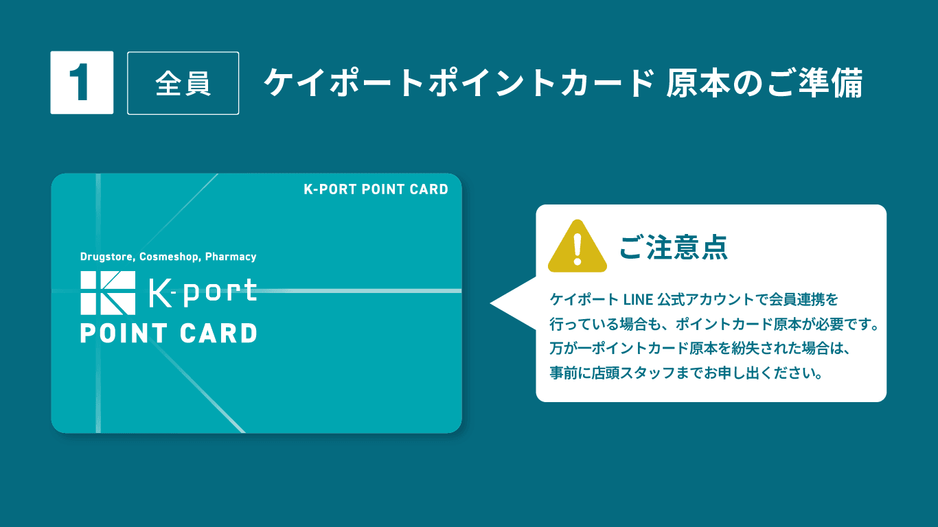 ケイポートLINE公式アカウントで会員連携をしている場合も、ポイントカード原本が必要です。